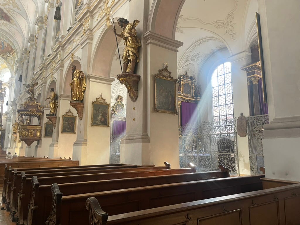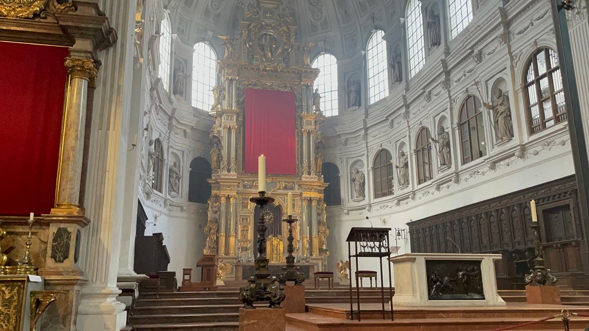 I wander into St. Michael’s church in the Munich old town. I am not typically a fan of baroque art, but I have never seen German baroque. I accept Versailles but baroque just reminds me of pre-enlightenment American Evangelicalism.