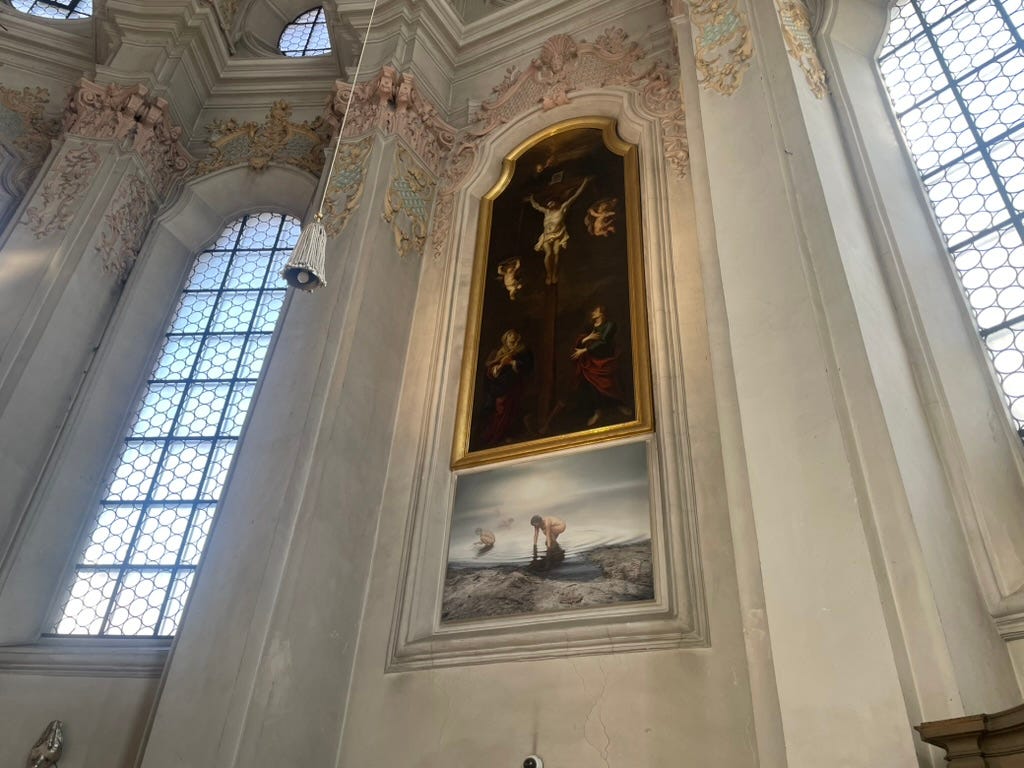 After my first real pretzel (the outside is supposed to be crispy! Knusprig ! Warum hat mir niemand niemals gesagt?? Dachte ich dass Ditsch die Optimale war, weil die so warme sind, aber den sind Kissensanft …) he shows me a church dedicated to the Holy Spirit featuring a unique cycle of paintings of the most abstract aspect of the triune Godhead. The figurative symbolism of the Holy Spirit is limited to a dove, or a flame, or water, so I found the subject matter ambitious if not surreal.