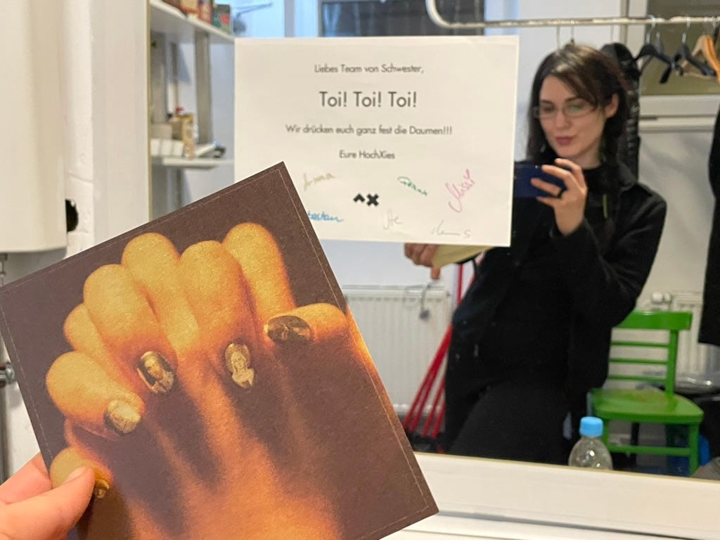 I’m looking forward to rehearsal this evening. The experimental theater piece, Schwestern, premieres tomorrow night. I met our dramaturge, Lulu, through her best friend, astrologer Aliza Kelly. When I first moved to Berlin everyone put me in touch with their friends in Berlin.